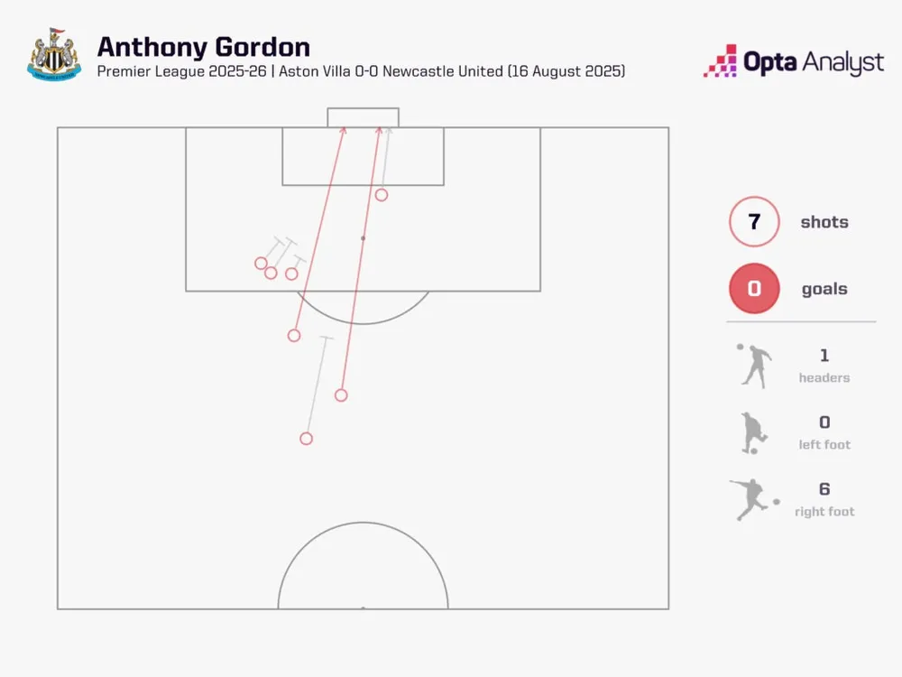 Tuy nhiên, sự vắng mặt của Isak là một tổn thất lớn. Newcastle đã không ghi bàn trong 4 trận Premier League gần nhất khi thiếu Isak, bỏ lỡ tới 47 cú sút với tổng giá trị bàn thắng kỳ vọng (xG) lên tới 5.57. Anthony Gordon, người được đẩy lên đá trung phong ở trận hòa 0-0 trước Aston Villa cuối tuần trước, đã tung ra 7 cú sút – nhiều nhất trong một trận đấu ở vòng 1 Premier League – nhưng không thể ghi bàn. Điều này cho thấy Newcastle đang gặp vấn đề nghiêm trọng ở khâu dứt điểm khi thiếu vắng ngôi sao chủ lực.