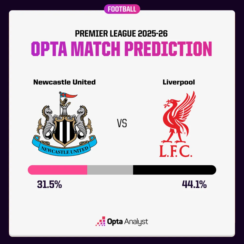 Theo siêu máy tính Opta, Liverpool được đánh giá cao hơn với 44.1% cơ hội chiến thắng, so với 31.5% của Newcastle và 24.4% cho một trận hòa. Tuy nhiên, với lợi thế sân nhà và sự cuồng nhiệt từ CĐV, Newcastle hoàn toàn có thể tạo nên bất ngờ, như họ đã làm trong trận hòa 3-3 đầy kịch tính với Liverpool vào tháng 12 năm ngoái.