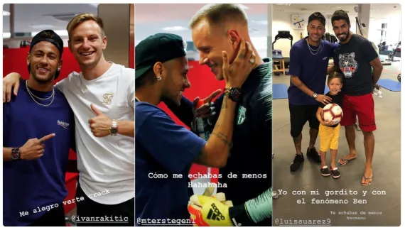 Neymar đã đăng lên trang Instagram của mình bức ảnh anh chụp chung với Ivan Rakitic, Marc-Andre ter Stegen và Luis Suarez khi ghé thăm các đồng đội cũ.