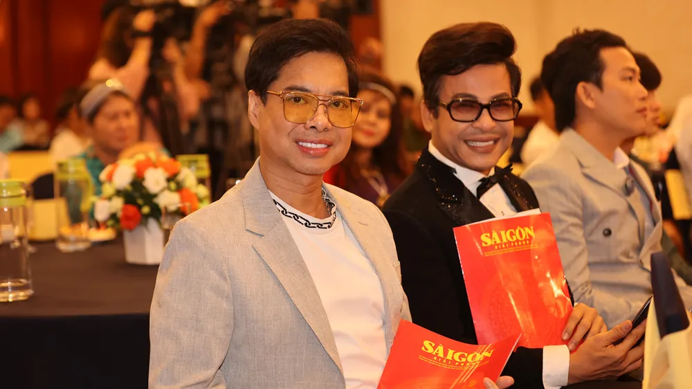 Đại diện BTC chụp hình cùng MC Thanh Bạch. Ảnh: DŨNG PHƯƠNG Và thật trùng hợp, ngày diễn ra buổi họp báo Quả bóng vàng Việt Nam 2020 trùng với sinh nhật của ca sĩ - nhạc sĩ Ngọc Sơn.