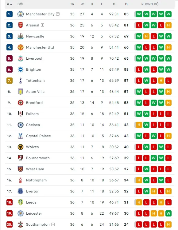 Arsenal dẫn đầu trong một thời gian dài, phải tránh thất bại trước Forest để níu kéo hy vọng mong manh, nhưng việc Man City về đích chỉ còn là vấn đề thời gian khi họ chỉ cần thắng 1 trong 3 trận còn lại.