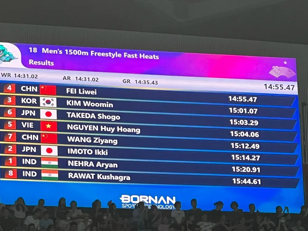 Chung kết cự ly 1.500m tự do nam của ASIAD 19 thi đấu tối 26-9 tại Hàng Châu (Trung Quốc) có 8 VĐV góp mặt gồm Nguyễn Huy Hoàng, Fei Liwei (Trung Quốc), Wang Ziyang (Trung Quốc), Nehra Aryan (Ấn Độ), Rawat Kushagra (Ấn Độ), Imoto Ikki (Nhật Bản), Takeda Shogo (Nhật Bản), Kim Woomin (Hàn Quốc).