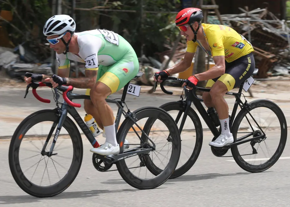 Đội TPHCM lên làm đầu máy kéo. Ảnh: HOÀNG HÙNGTuy nhiên, chỉ có một tình tiết đáng chú ý khi cách đích chừng 6 km, hai anh chàng đồng hương người Nga, một của TPHCM Vinama là Áo vàng Igor Frolov và một của đội Tập đoàn Lộc Trời là Roman Maikin rủ nhau thoát đi. Dù là khác đội nhưng là đôi bạn thân từ trước, hai tay đua đẳng cấp cao này hợp sức đã khiến đoàn đông phía sau, nhất là đội Domesco Đồng Tháp phải kéo trối chết mới bắt kịp.
