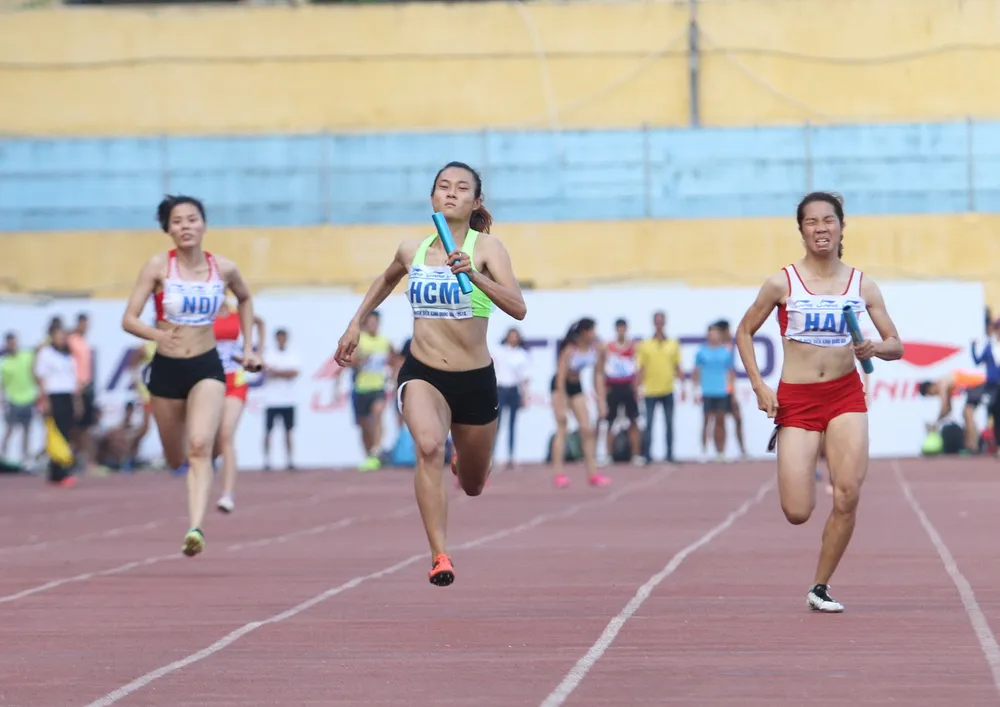 Tú Chinh (giữa) giúp tổ tiếp sức 4x100m nữ TPHCM phá kỷ lục Đại hội TDTT toàn quốc.