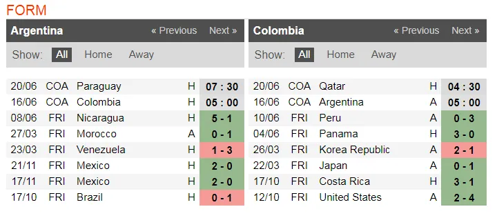 Colombia từng gặp Argentina trong trận giao hữu hồi tháng 9 năm ngoái và kết thúc với tỷ số hòa 0-0, đó cũng là trận thứ 5 liên tiếp họ không ghi bàn vào lưới Argentina.