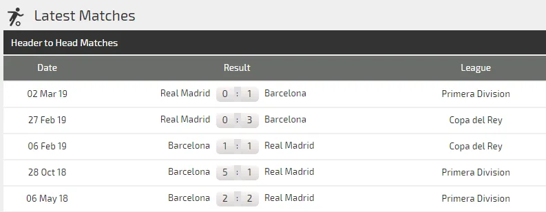 Nhưng phong độ chắc chắn không phải là yếu tố quyết định cuộc chiến này, trong lúc lịch sử vẫn đang nghiêng về chủ nhà khi đội chủ sân Nou Camp bất bại 6 trận El Clasico gần nhất, và thắng 4 trong số đó. Mùa trước, họ gặp nhau 4 lần, 2 lần tại La Liga và 2 lần ở Cúp Nhà vua, và Real chỉ ghi được 2 bàn thắng nhưng lại để thủng lưới tới 9 bàn.