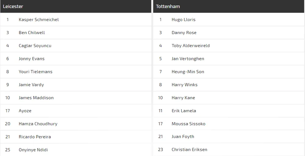 Leicester City chỉ thiếu cầu thủ chấn thương bấy lâu là Matthew James (Achilles). Tottenham vẫn còn thiếu Giovani Lo Celso (đau hông) và Ryan Sessegnon (gân kheo) trong lúc Juan Foyth (mắt cá) đã tập luyện trở lại.