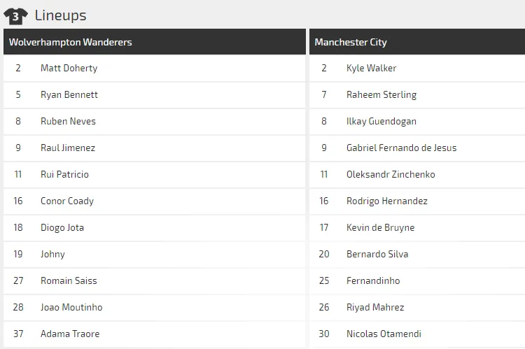 Wolves mùa này vất vả khi đeo bám Europa League. Họ không có chấn thương mới nhưng Willy Boly (mắt cá) và Morgan Gibbs-White (đau lưng) vẫn còn ngồi ngoài. Phía Manchester City, trung về John Stones (gân kheo) vẫn chưa thể ra sân, song CLB hy vọng có thể kiểm tra giờ chót xem David Silva có kịp ra sân hay không.