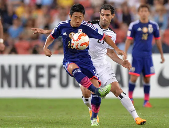 Shinji Kagawa (trái, Nhật) đi bóng qua hậu vệ Iraq ở Asian Cup 2015