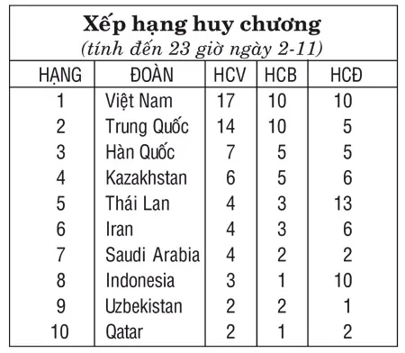 (SGGPO).- Hôm nay, 2-11, đoàn thể thao Việt Nam lại có một ngày thi đấu thành công khi đoạt thêm 6 HCV, gồm: 1 HCV ở môn Kurash (hạng cân 52 kg nữ), 2 HCV môn lặn vòi hơi chân vịt nam - nữ, 2 HCV ở môn Vovinam và 1 HCV múa lân, nâng tổng số HCV của đoàn chủ nhà lên 17 chiếc để giành lại ngôi nhất toàn đoàn từ tay Trung Quốc.