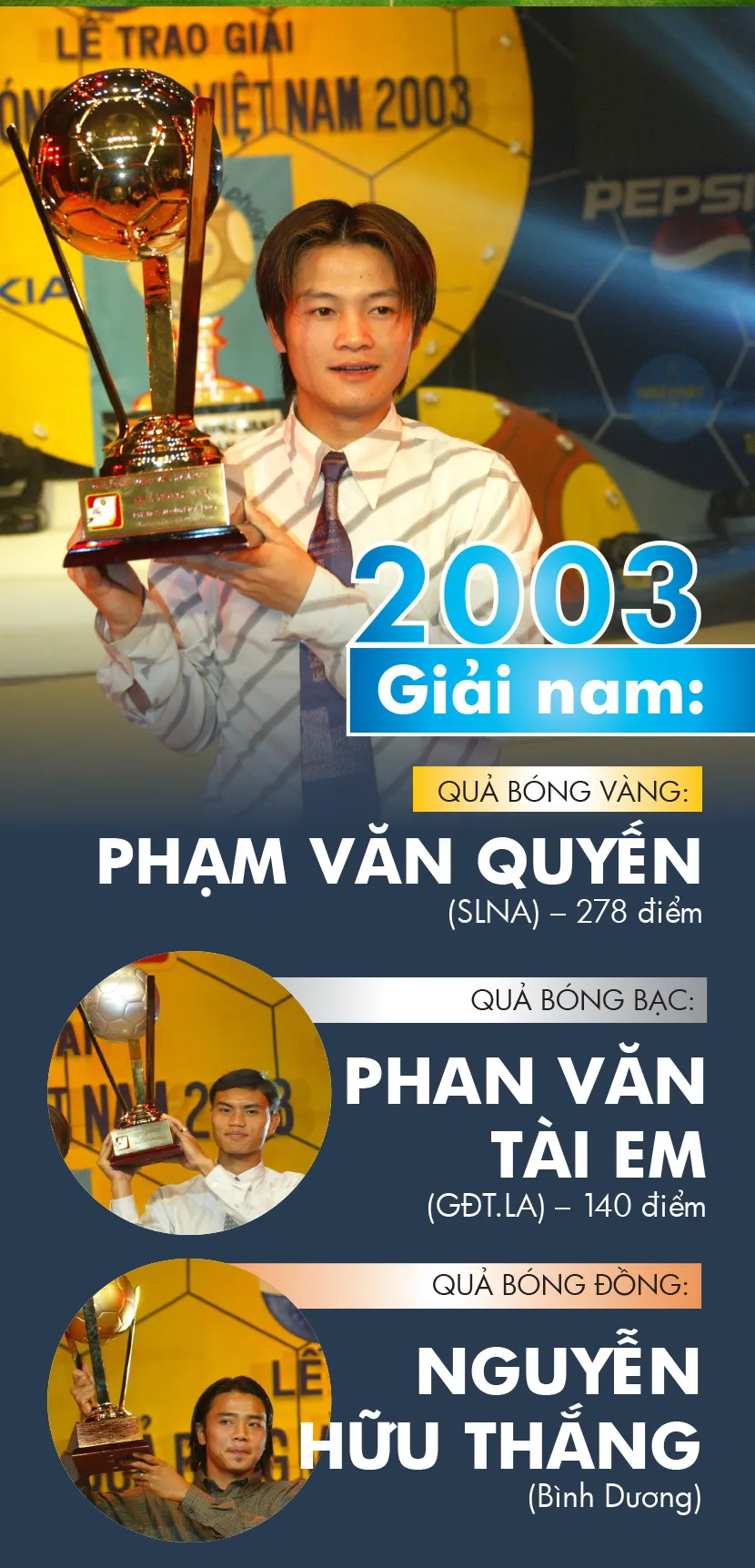 Một năm sau khi giành danh hiệu Cầu thủ trẻ xuất sắc, Phạm Văn Quyến đã vượt lên tất cả để giành giải thưởng Quả bóng vàng 2003 để giúp cho Quyến được ví như "Cậu bé vàng" của bóng đá Việt Nam.