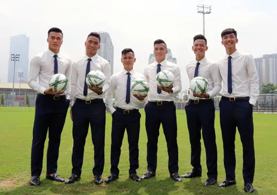 Các cầu thủ thích thú lần đầu được diện vest. Ảnh: VFF