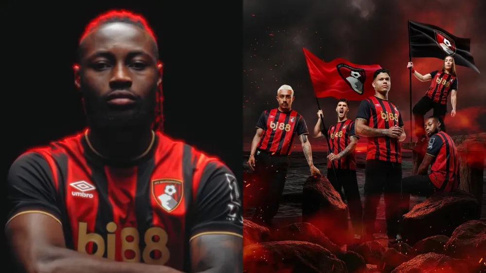 Logo nhà tài trợ “bj88” trên áo Bournemouth là một thảm họa. Khó mà nhìn qua để đánh giá áo Umbro, nhưng áo có sọc dọc đen-đỏ với hiệu ứng “cát gợn sóng” gợi vị trí ven biển, cổ và tay áo viền vàng.