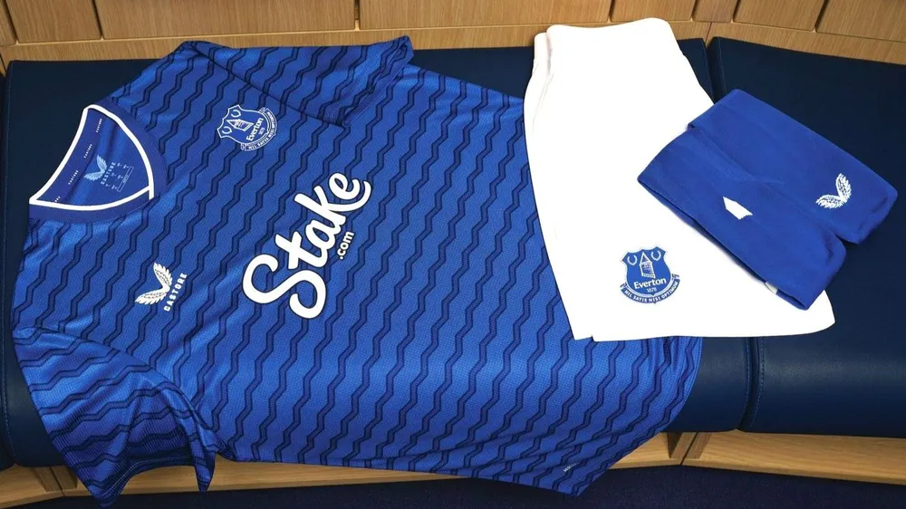Áo sân nhà Everton màu xanh với hoa văn sóng, đại diện cho sông Mersey và sân mới ven sông. Tất có hình bóng tháp Prince Rupert. Áo sân khách vàng nhạt, quần đùi xanh, cổ tay gợi đường ray cũ của bến cảng Liverpool. Áo thứ ba có thể màu đen với tháp Prince Rupert. Áo thủ môn xanh (sân nhà) hoặc đen (sân khách).