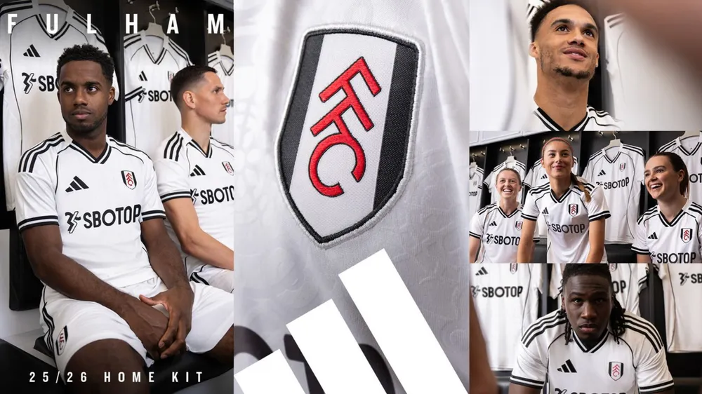 Áo sân nhà Fulham trắng hoàn toàn, cổ chữ V, viền đen, huy hiệu cao su tái hiện lan can Craven Cottage. Áo sân khách xanh lá vôi gợi nhớ áo 1999-2000. Áo thủ môn đỏ với chi tiết kim loại.