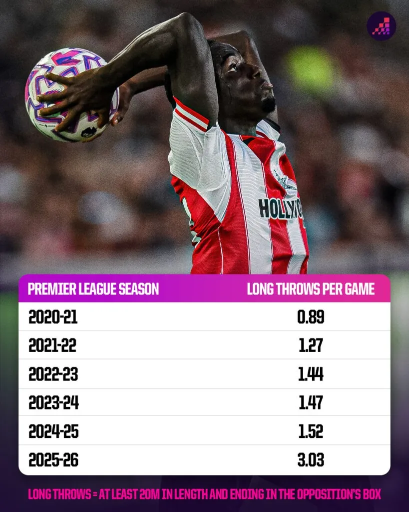 Mùa này, trung bình có 3,03 lần ném biên dài vào vòng cấm mỗi trận, gần gấp đôi so với bất kỳ mùa giải nào trong 10 năm qua (cao nhất trước đó là 1,67 lần mỗi trận vào năm 2018-19). Mùa 2020-21 chỉ có 0,89 lần mỗi trận. Mùa trước, 14 bàn thắng được ghi từ ném biên dài vào vòng cấm, nhiều hơn bất kỳ mùa nào kể từ 2015-16, và vượt tổng số bàn của hai mùa trước đó (8 bàn năm 2022-23 và 5 bàn năm 2023-24). Tổng xG (bàn thắng kỳ vọng) từ ném biên dài mùa 2024-25 là 15,9, cho thấy tiềm năng ghi bàn lớn hơn.