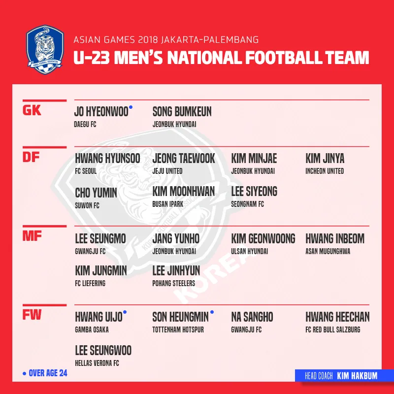 Nhà cầm quân Kim Hakbum không để cho các ngôi sao World Cup được nghỉ ngơi khi phát lệnh triệu tập cầu thủ tấn công hay nhất hiện nay là Son Heung-min cùng thủ thành Jo Hyeo-woo để chuẩn bị cho cuộc hành trình tại ASIAD 18 diễn ra vào tháng 8 ở Indonesia. Son Heung-min chính là cầu thủ ấn định chiến thắng ấn tượng 2-0 cho Hàn Quốc ở lượt trận cuối cùng tại World Cup 2018, chính thức loại đội tuyển Đức khỏi cuộc chơi.