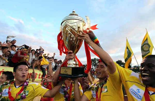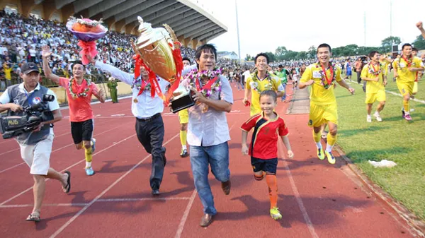 HLV Hữu Thắng đưa đội bóng quê nhà đoạt chức vô địch quốc gia lần đầu tiên sau 1 thập niên hồi năm 2011. Ảnh: T.L