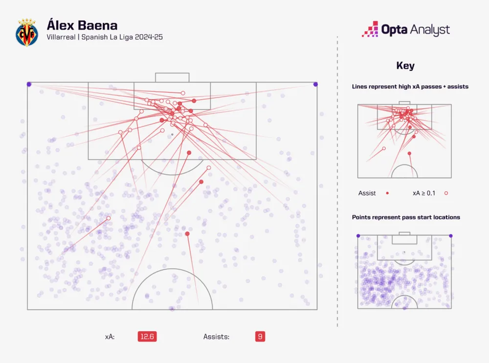 Nếu mùa 2024-25 là điệu nhảy cuối cùng của anh với câu lạc bộ, thì Baena ít nhất đã để lại Tàu Ngầm Vàng ở một vị trí tuyệt vời. Trong đội hình giành vé dự Champions League mùa sau, anh đóng vai trò quan trọng, dẫn đầu La Liga mùa này về số cơ hội tạo ra (95) và số kiến tạo kỳ vọng (12.6). Cầu thủ trưởng thành từ lò đào tạo Villarreal cũng có 16 lần góp công vào bàn thắng trong mùa giải, với 7 bàn và 9 kiến tạo, củng cố vị thế của anh như một trong những cầu thủ tấn công đa năng thực thụ tại La Liga. Chỉ có Lamine Yamal và Raphinha của Barcelona đạt được số bàn thắng và kiến tạo tương đương, hai người góp phần giúp đội bóng ghi tới 102 bàn tại La Liga mùa này.