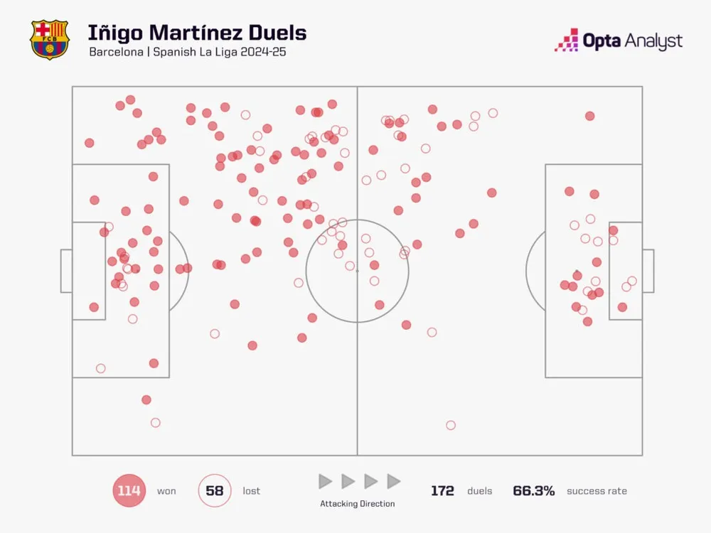 Nhưng để chơi cho Barcelona, bạn cần thoải mái với bóng, và Martínez hoàn toàn làm được. Không hậu vệ nào ở La Liga thực hiện nhiều pha kéo bóng tiến lên hơn anh mùa này (514), trong khi chỉ có Marcos Alonso của Celta Vigo (736) thực hiện nhiều pha mang bóng tổng cộng hơn (698). Martínez còn ghi dấu với 4 kiến tạo trong 28 trận La Liga mùa 2024-25, bằng tổng số kiến tạo trong 377 trận trước đó của anh. Anh cũng hoàn thành tốt nhiệm vụ phòng ngự, với 126 lần thu hồi bóng, nhiều nhất trong số các hậu vệ Barcelona, và trong số các hậu vệ La Liga tham gia ít nhất 100 tranh chấp, chỉ có hai người có tỷ lệ thắng tranh chấp cao hơn Martínez (114/172 – 66.3%).