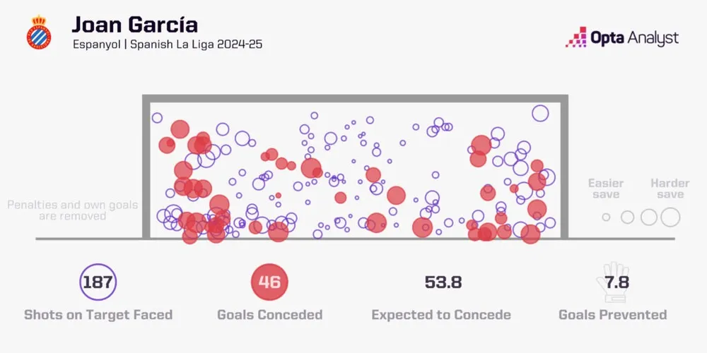 Espanyol để thủng lưới 51 bàn, con số có thể tệ hơn nhiều nếu không có García. Không thủ môn nào ở La Liga thực hiện nhiều pha cứu thua hơn (146) hoặc cứu thua từ các cú sút trong vòng cấm (89). Những con số này không chỉ thể hiện số cú sút anh phải đối mặt mà còn phản ánh áp lực mà Espanyol, và do đó là García, phải chịu mỗi khi ra sân. Anh dẫn đầu giải về số bàn thắng ngăn chặn (+7.6) và đạt tỷ lệ cứu thua 75%, cao thứ tư trong giải.