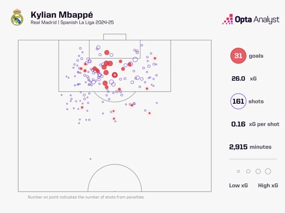 Tiền đạo người Pháp ghi 31 bàn trong 34 trận tại La Liga mùa 2024-25, không cầu thủ nào ở năm giải đấu hàng đầu châu Âu chạm mốc 30. Chỉ Pruden Sánchez (Atlético Madrid, 1940-41, 33 bàn) và Ronaldo (Barcelona, 1996-97, 34 bàn) ghi nhiều bàn hơn trong mùa đầu tiên tại La Liga trong lịch sử giải đấu. Những bàn thắng đó thường mang tính quyết định. Mbappé mang về 25 điểm cho đội qua các bàn thắng, nhiều hơn bất kỳ cầu thủ nào tại La Liga mùa này.