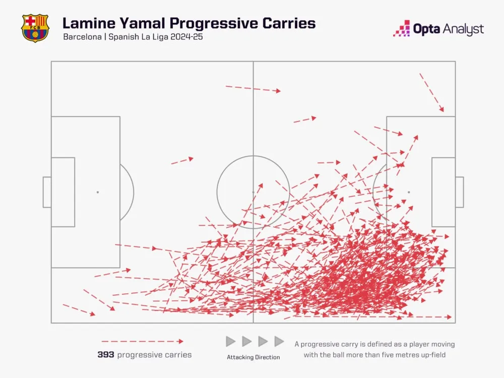 Dưới thời HLV Flick mùa này, Yamal đã góp phần tạo nên bộ ba tấn công đáng sợ nhất châu Âu. Những pha đi bóng lắt léo và tinh thần tích cực không ngừng nghỉ khiến anh trở thành nỗi ác mộng với các hậu vệ. Tại La Liga mùa này, anh dẫn đầu về số lần rê bóng dẫn đến cú sút (56) và số lần rê bóng tạo cơ hội (35). Tổng cộng 91 hành động tạo cơ hội sút của anh vượt xa mọi cầu thủ khác, với người gần nhất là Kylian Mbappé (67). Mười trong số những pha rê bóng đó dẫn đến bàn thắng (3) hoặc kiến tạo (7), chỉ có Vinícius Júnior (11) sánh ngang hoặc vượt qua Yamal.
