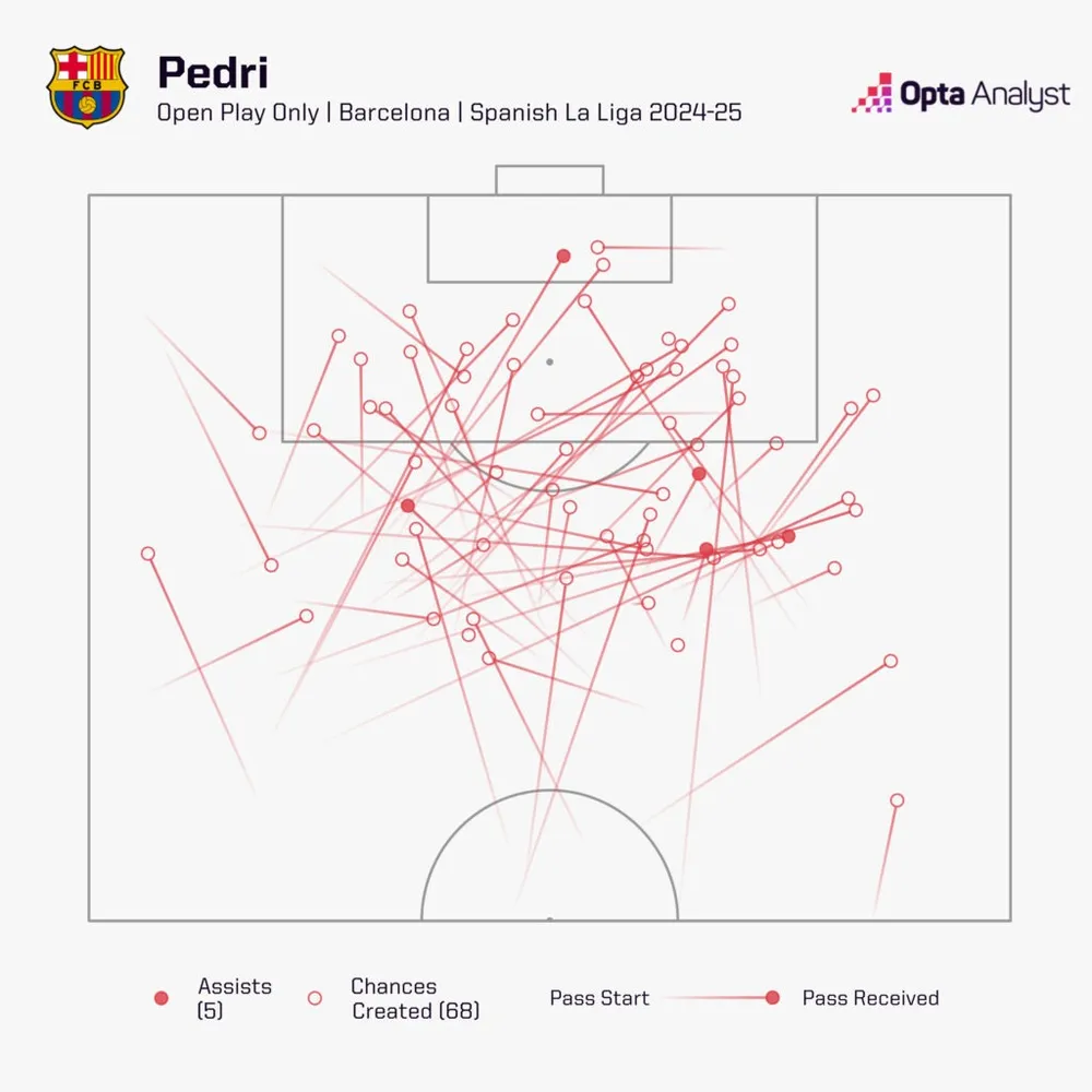 HLV Flick bố trí Pedri chơi thấp hơn mùa này để khai thác tối đa sự xuất sắc của anh. Cầu thủ Tây Ban Nha dành 70% trong 2.892 phút ở La Liga làm tiền vệ phòng ngự, và kết quả thật phi thường. Anh thực hiện (2.672) và hoàn thành (2.379) nhiều đường chuyền nhất giải. Nhưng vẻ đẹp của Pedri là anh vừa điều tiết nhịp độ trận đấu vừa duy trì sản lượng sáng tạo cao. Không tiền vệ nào tạo ra nhiều cơ hội từ tình huống mở hơn Pedri mùa trước (68), đồng thời dẫn đầu giải về số đường chuyền tiến lên trong số các tiền vệ (653).