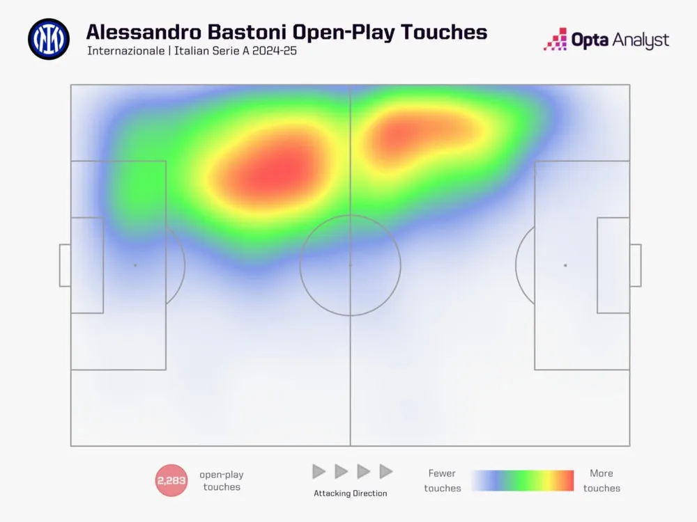 Hậu vệ của Inter có tỷ lệ tạt bóng chính xác từ tình huống mở cao nhất trong số các hậu vệ thực hiện ít nhất 10 lần tạt – đạt 43,7% trên 64 lần tạt bóng mở (28 lần thành công). Điều này hiếm thấy ở một trung vệ, thể hiện khả năng mang bóng ra biên và sáng tạo của anh. Bastoni dẫn đầu các trung vệ về số đường kiến tạo (5) và tạo ra nhiều cơ hội hơn bất kỳ trung vệ nào khác (24) – cho thấy anh thường xuyên đóng vai trò như một tiền vệ kiến thiết lùi sâu cho đội bóng của Simone Inzaghi.
