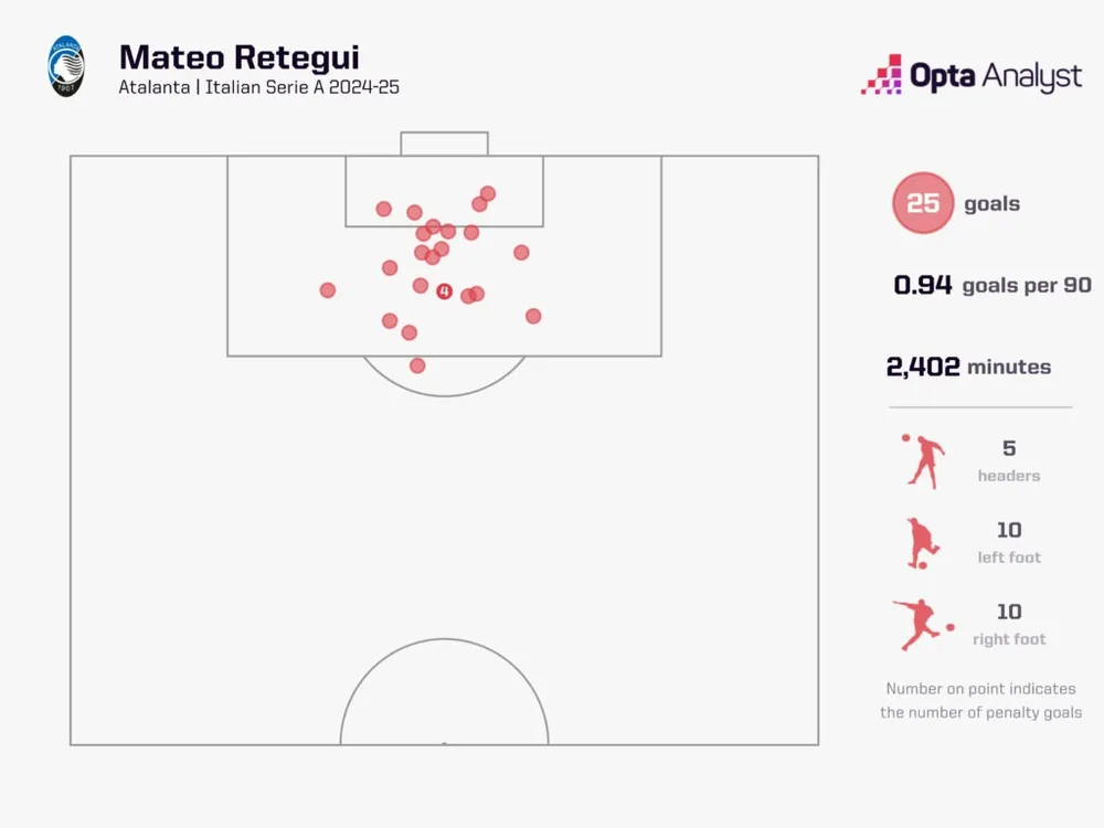 Anh là cầu thủ duy nhất ở Serie A ghi ít nhất 10 bàn bằng cả chân phải và chân trái. Retegui còn tạo ra 38 cơ hội từ tình huống mở, chỉ có 12 cầu thủ trong giải đấu làm tốt hơn.