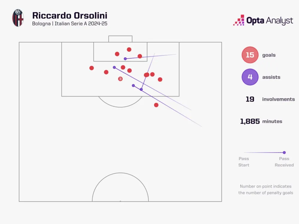 Chỉ Mateo Retegui (25) và Moise Kean (19) ghi nhiều bàn hơn Orsolini ở Serie A mùa này, với 15 bàn trong 30 trận, trung bình một bàn mỗi hai trận. Không cầu thủ Bologna nào khác ghi quá 8 bàn. Tổng cộng, cầu thủ 28 tuổi này có mùa giải Serie A năng suất nhất từ trước đến nay với 19 lần góp công vào bàn thắng (4 kiến tạo), ghi được nhiều bàn và kiến tạo nhất trong một mùa giải trong sự nghiệp.