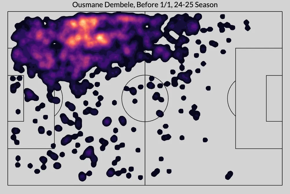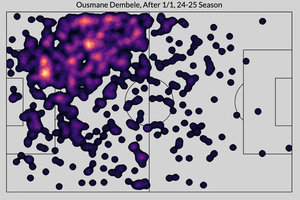 Có xu hướng gọi Dembélé là “số 9 ảo” vì anh chưa từng chơi trung phong trước đây. Nhưng số 9 ảo điển hình là người lùi sâu để nhường chỗ cho cánh và tiền vệ băng lên. Dembélé lùi sâu để hỗ trợ – rồi cũng băng vào vòng cấm. Dembélé cũng là một trong năm cầu thủ ở châu Âu có ít nhất 100 pha chạm bóng trong vòng cấm đối phương năm 2025. Nói cách khác, anh nằm trong top 10 về rê bóng, chuyền vào vòng cấm, và tìm khoảng trống trong vòng cấm. Và anh còn vượt xa mọi người về ghi bàn.