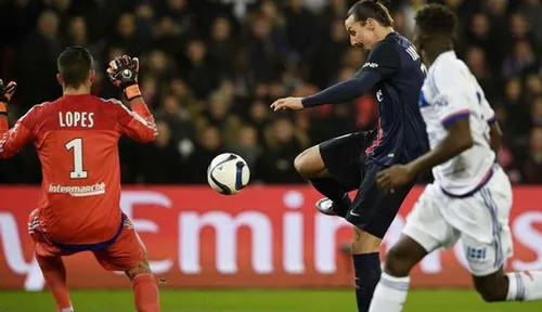 Zlatan Ibrahimovic (giữa, Paris SG) sút bóng qua tay thủ thành Lopes (Lyon).