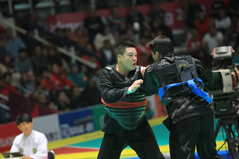 Nguyễn Văn Trí (trái) giành HCV đối kháng đầu tiên cho pencak silat Việt Nam.