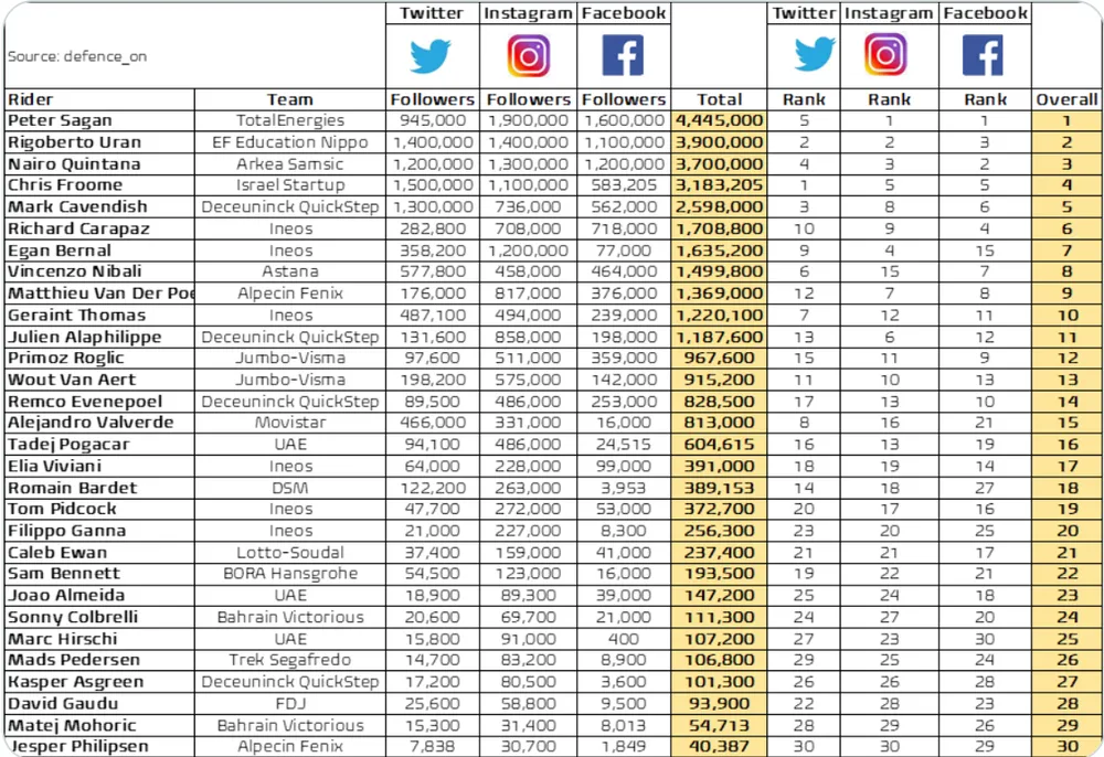 Nhưng Tadej Pogacar, mặc dù 2 năm liền chiến thắng Tour de France, chỉ có thể đứng thứ 16 với 604.615 người theo dõi. Có khoảng cách rất lớn giữa nhóm 16 tay đua đứng đầu với những người tiếp theo. Elia Viviani xếp thứ 17 nhưng chỉ có 391.000 người theo dõi.