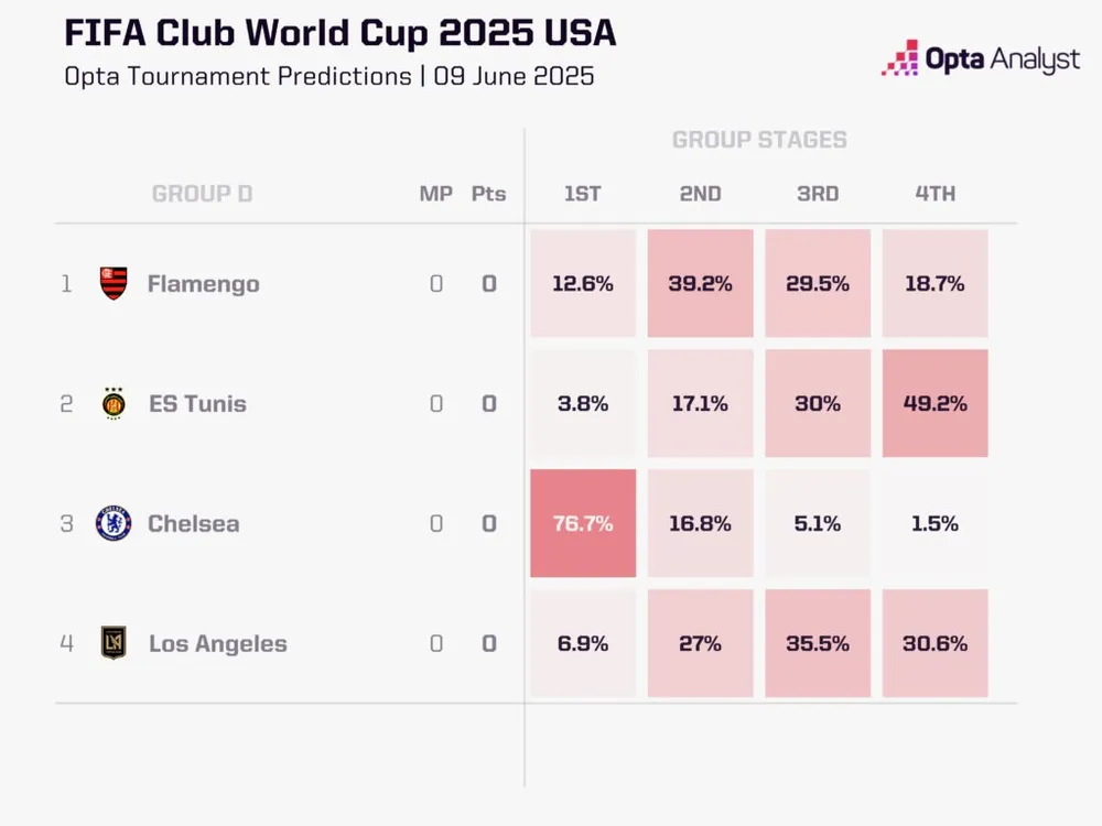 Mối đe dọa lớn nhất của Chelsea trong bảng D là Flamengo, đội được siêu máy tính Opta đánh giá có 51,8% cơ hội vào vòng knock-out.