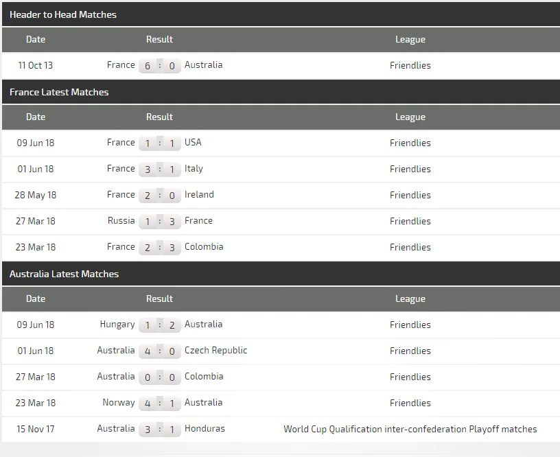 Lần gặp gần nhất giữa họ là trận giao hữu năm 2013, nơi Pháp thắng đậm Australia đến 6-0. Lúc này, Pháp đang cực kỳ trẻ trung và sung sức, trong lúc Socceroos suy giảm chất lượng đội hình và phải gọi lại lão tướng Tim Cahill.