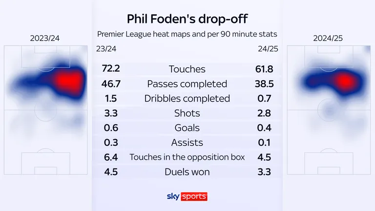 Nếu mùa trước Foden ghi 27 bàn và 12 kiến tạo, đóng góp lớn giúp Man City vô địch, thì hiện tại hiệu suất của anh giảm một nửa (0.5 bàn tham gia/90 phút so với 0.85). Đây là mức thấp nhất kể từ khi anh lên đội 1 dưới thời Pep Guardiola. Foden cũng ít tham gia tranh chấp, giảm 50% pha rê bóng thành công và ít xuất hiện trong vòng cấm hơn. Dù phải xoay vị trí giữa tiền vệ cánh phải và số 10, nhưng đây không phải nguyên nhân chính - mùa trước anh vẫn tỏa sáng trong hoàn cảnh tương tự.