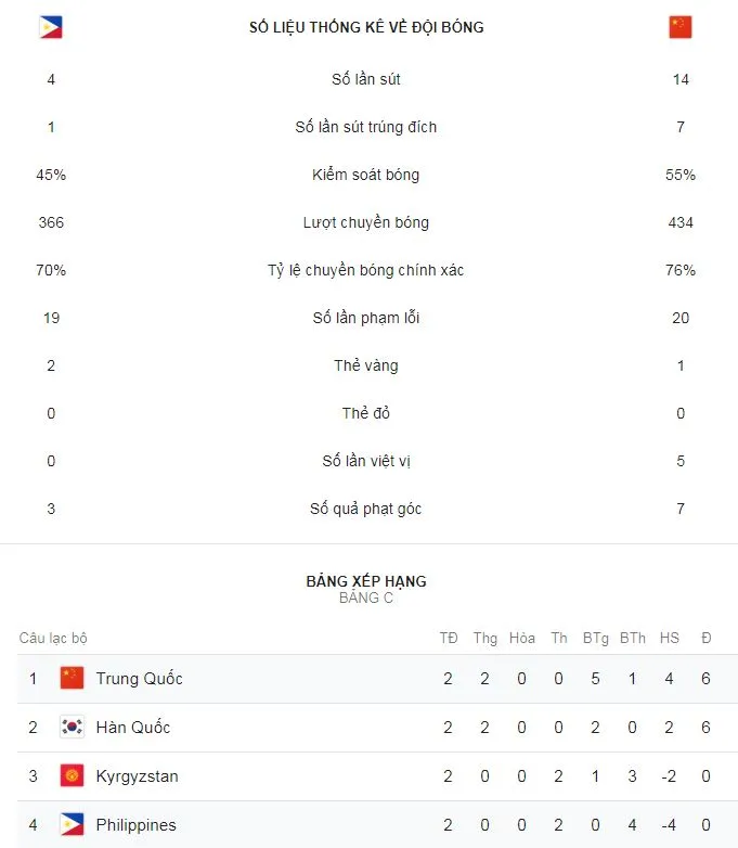 Tuyển Trung Quốc khai màn đầy tự tin trước đối thủ Philippines, đoàn quân của Marcelo Lippi được đánh giá cao hơn HLV Sven-Goran Eriksson. Tiền đạo Wu Lei lập 2 siêu phẩm và Yu Dabao ấn định chiến thắng. Chung cuộc 3-0, Trung Quốc dẫn đầu bảng C và nếu Kyrgyzstan thua Hàn Quốc, thì Trung Quốc sẽ giành vé vào vòng knock-out.