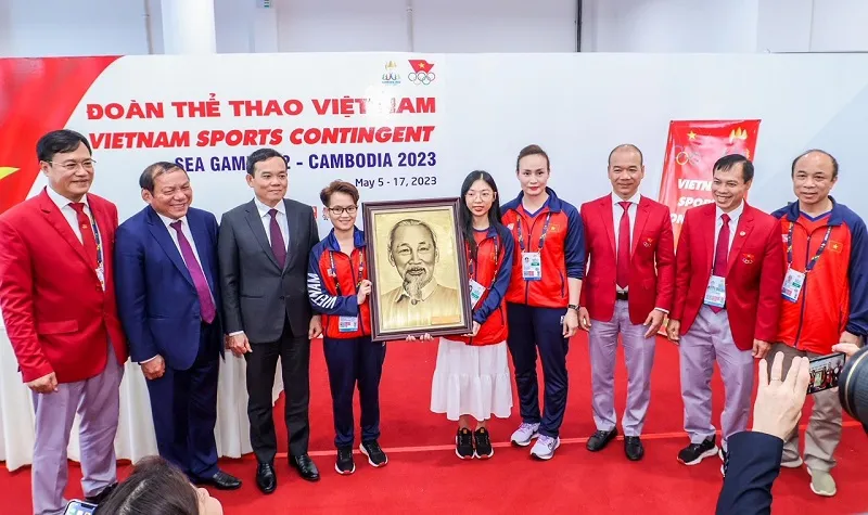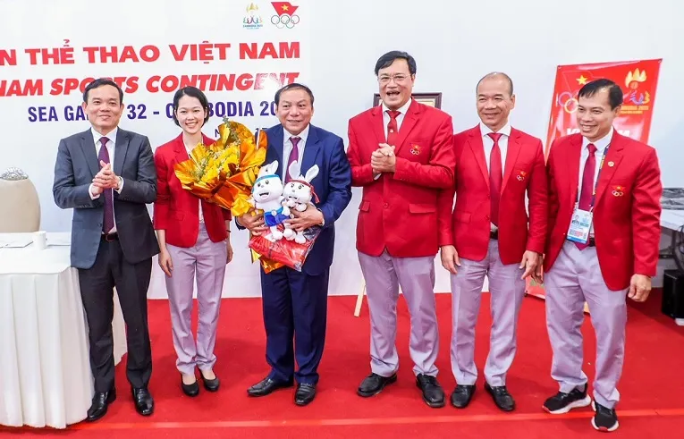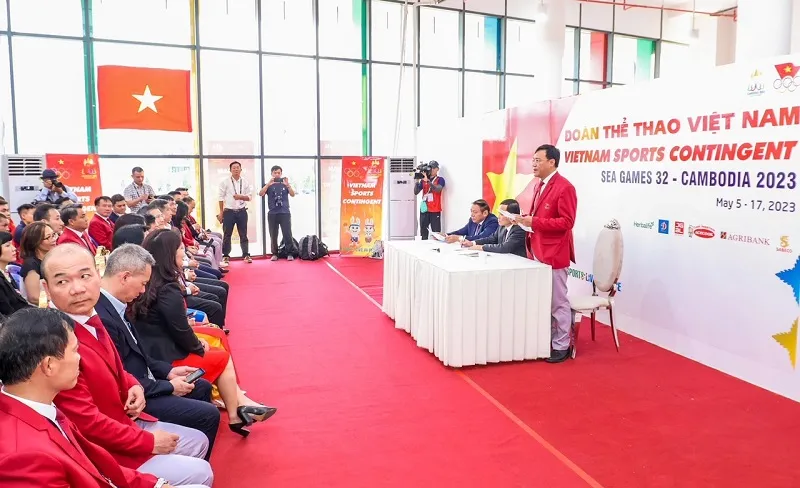 Tổng cục trưởng Tổng cục TDTT đồng thời là Trưởng Đoàn thể thao Việt Nam tại SEA Games 32 – ông Đặng Hà Việt đã báo cáo tình hình của Đoàn thể thao Việt Nam tới lúc này tại SEA Games 32. Cho đến thời điểm hiện tại, Đoàn thể thao Việt Nam gồm 451 thành viên là cán bộ, bác sĩ, lãnh đội, chuyên gia, HLV, VĐV của 21 đội tuyển đã có mặt tại Campuchia. “Hiện tại, toàn đoàn mạnh khỏe, không có tuyển thủ nào bị chấn thương và đoàn đã thi đấu 5 môn thể thao gồm cờ ouk chaktrang, sailing, bóng đá nam, bóng đá nữ, bóng chuyền nam, jujitsu. Trong đó môn cờ ouk chaktrang sớm giành HCV trước 1 vòng đấu. Tất cả đoàn thể thao đều quyết tâm có thành tích tốt nhất và trân trọng sự quan tâm của Đảng, Nhà nước và nhân dân từ quê nhà”, Trưởng Đoàn thể thao Việt Nam bày tỏ.