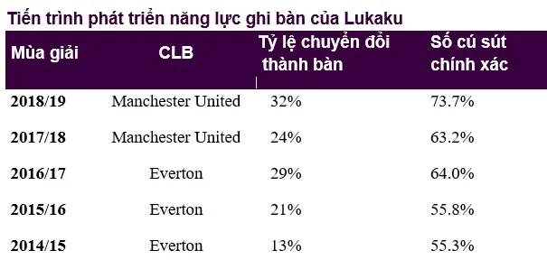 Những nhà thống kê ghi nhận, với 3 bàn thắng từ cự ky trung bình bằng chân phải giúp Lukaku có được 5 bàn từ chân không thuận của mình. Mùa qua anh đã ghi 11 bàn bằng chân trái và 3 qủa bằng đánh đầu, còn chân phải chỉ được 2 bàn. Đây có lẽ là chiến dịch mà Lukaku đã tập luyện cật lực để phát triển năng lực ủa mình trong khu cấm địa, tránh để các hậu vệ bắt bài.