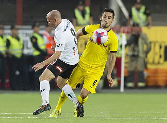Ilkay Gundogan (phải, Dortmund) khống chế bóng trước Jone Samuelsen (Odd Ballklubb). Ảnh: Getty Images