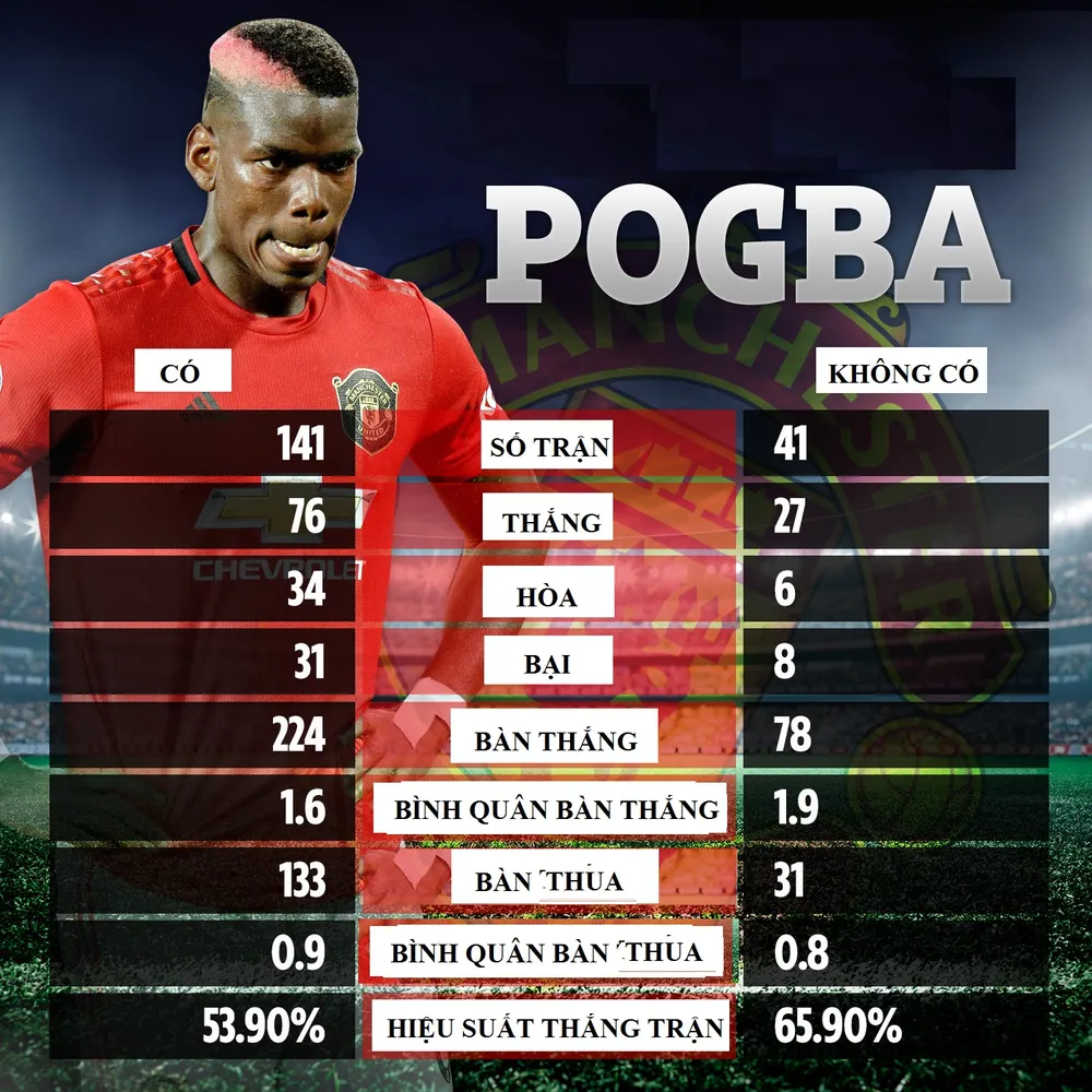Website ESPN quả quyết là Pogba vẫn có tầm ảnh hưởng to lớn với phong độ cùa Quỷ đỏ khi đưa ra thông điệp “những con số thống kê không nói dối”. Trong đó họ so sánh thành tích của Man United khi có và không có Paul Pogba trên 3 khía cạnh: