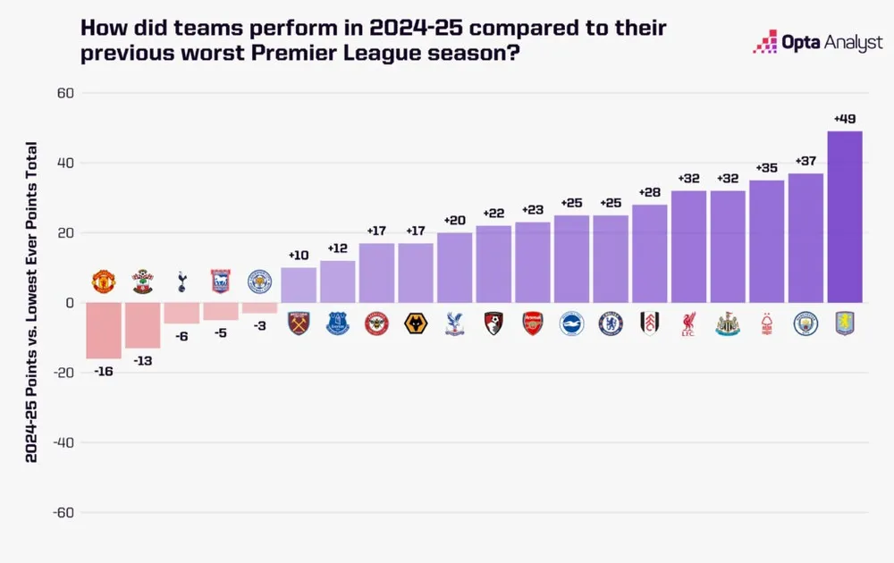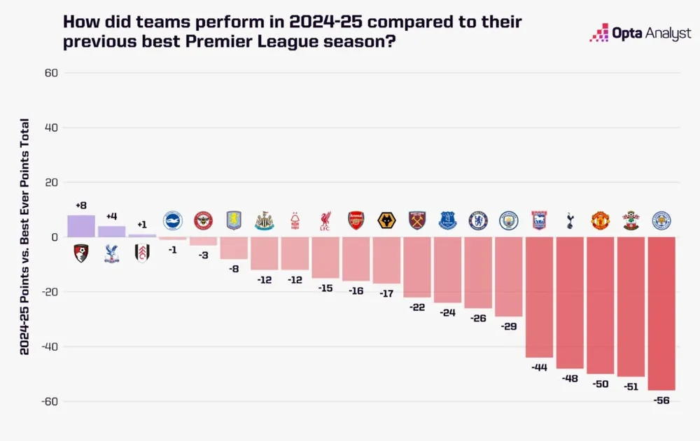 Trước đây, vị trí tệ nhất của họ tại Premier League là thứ tám (mùa 2023-24), trong khi tổng điểm thấp nhất trước mùa 2024-25 là 58 điểm vào năm 2021-22. Mùa này, họ kém xa con số đó tới 16 điểm; trong số năm câu lạc bộ ghi nhận điểm số tệ nhất mọi thời đại trong mùa 2024-25, đó là mức sụt giảm lớn nhất.