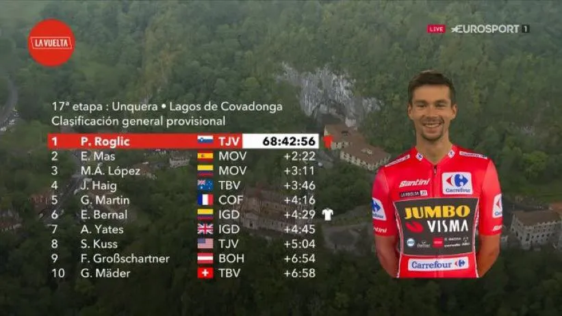 Với kết quả này, Primoz Roglic đã đòi lại áo đỏ tổng sắp với thành tích 68 giờ 42 phút 56 giây, hơn người thứ hai Enric Mas (Movistar) đến 2 phút 22 giây.