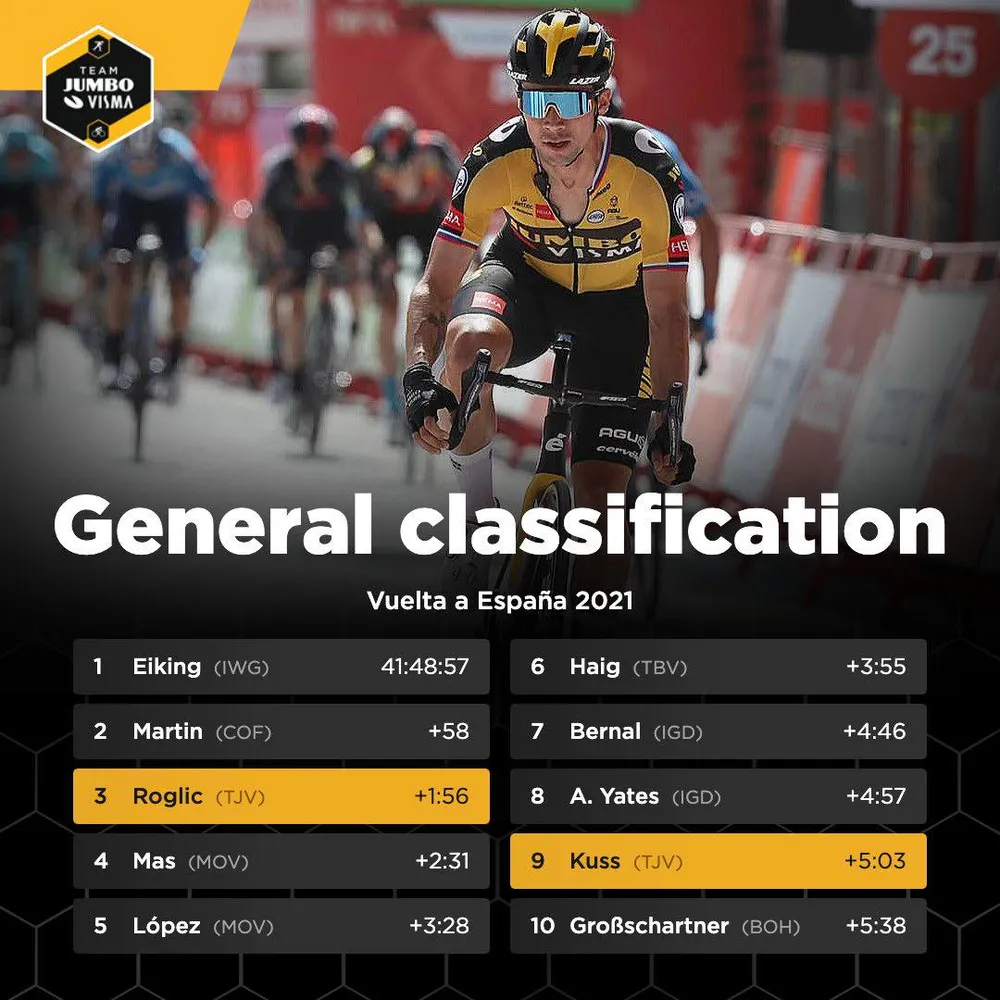 Primoz Roglic (Jumbo-Visma) và Enric Mas Nicolau (Movistar) dẫn đầu cuộc rượt đuổi. Sức kéo quá mạnh giúp hai tay đua này chẳng những bắt kịp Magnus Cort mà còn “bứt” khỏi toán đông để lao về đích. Kết quả, Primoz Roglic đã rút giãn Enric Mas Nicolau để một mình cán đích đầu tiên với thời gian 3 giờ 11 phút, hơn đối thủ 3 giây.