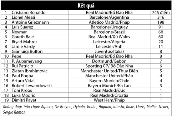 Đêm 12-12 vừa qua (rạng sáng 13-12, theo giờ Việt Nam), France Football công bố kết quả của cuộc bầu chọn Quả bóng vàng 2016. Đúng như những thông tin rò rỉ từ vài ngày trước, Ronaldo giành chiến thắng tuyệt đối. Tổng số điểm mà cầu thủ người Bồ Đào Nha giành được là 745, trong khi người đứng sau anh - Lionel Messi - có 316 điểm.