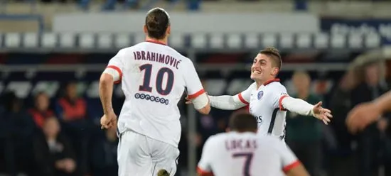 Zlatan Ibrahimovic ăn mừng bàn thắng cùng đồng đội Paris SG.