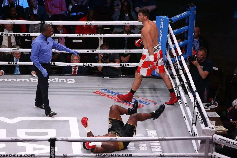 Hrgovic lạnh lùng quay về góc đài của mình sau khi đấm gục Corbin