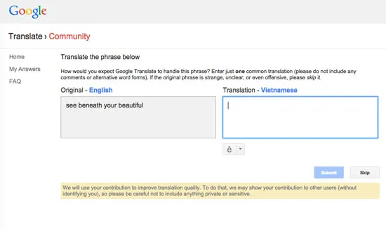 Chức năng này hiện hỗ trợ hơn 90 ngôn ngữ khác nhau và cho phép người dùng đóng góp qua 2 hình thức: Dịch và Xác nhận. Với hình thức Dịch, người dùng sẽ nhận được một từ hoặc cụm từ bằng ngôn ngữ đã chọn, và được yêu cầu cung cấp bản dịch ra ngôn ngữ còn lại (chẳng hạn Anh sang Việt, hoặc Việt sang Anh). Với hình thức Xác nhận, chức năng này sẽ đưa ra một từ hoặc cụm từ và yêu cầu người dùng xác nhận các phiên bản dịch là đúng hay sai, bằng cách nhấn vào nút chọn đúng/sai.